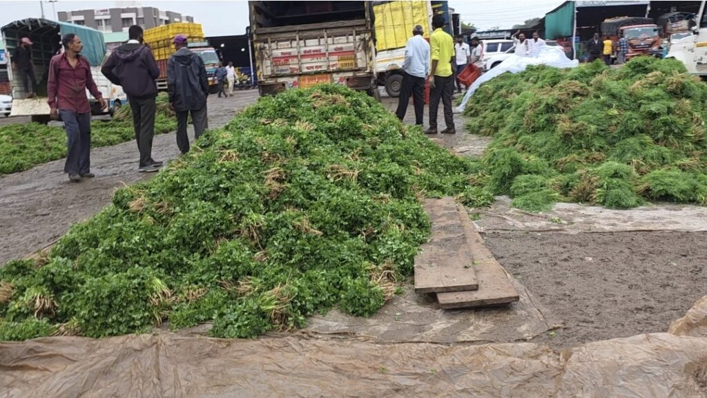 नारायणगाव : (प्रतिनिधी) जुन्नर कृषी उत्पन्न बाजार समितीच्या नारायणगाव येथील धन मेथी मार्केटमध्ये पावसाळ्यात हा भाजपाला भिजत असल्याने शेतकऱ्यांना प्लास्टिकचा कागद आणून त्याच्यावर कोथंबीर व मेथी टाकून झाकून ठेवावी लागत आहे. तसेच पावसाळी वातावरण असल्यामुळे चिखल व माती मार्केट कमिटीच्या आवारात येत असल्याने परिसरामध्ये अधिक चिखल होत असून यामुळे व्यापारी व शेतकरी यांची कुचुंबना होत आहे. यामुळे धना मेथीच्या बाजारभावावर परिणाम होण्याची भीती शेतकरी व्यक्त करत आहे.
