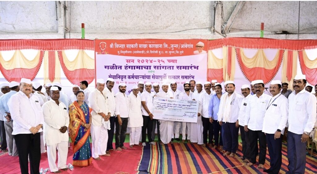 नारायणगाव : ( प्रतिनिधी) विघ्नहर सहकारी साखर कारखान्याचा कायमच धार्मिक कार्यामध्ये सहभाग असतो. त्याचाच एक भाग म्हणून जगदगुरु तुकोबाराय त्रिशतकोत्तर अमृत महोत्सवी सदेह वैकुंठगमन सांगता सोहळा निमित्त अखंड हरीनाम सप्ताह व संगित गाथा पारायण सोहळा जुन्नर तालुक्यातील श्री श्रेत्र ओतूर येथील चैतन्य महाराज समाधी स्थळ या ठिकाणी दिनांक- १८/५/२०२५ ते २५/५/२०२५ या कालावधीत संपन्न होत असून त्याठिकाणी विविध किर्तन सेवा व अन्नदान याचे दैनंदीन आयोजन असून त्या संदर्भात कारखाना स्थळावर वारकरी सप्रादयाचे भुषण गुरुवर्य ह.भ.प. ज्ञानेश्वर माऊली कदम व इतर वारकरी भेटीस्तव आले असता सदर सप्ताहास अन्नदानासाठी मदतीचा हात म्हणून विघ्नहर सहकारी साखर कारखान्याचे सर्व संचालक मंडळ, सभासद, ऊस उत्पादक, अधिकारी व कर्मचारी यांचे वतीने ५ लाख ५५ हजार ५५५ रुपयांचा धनादेश आज (दि.13) रोजी छोटी माऊली महाराज यांना सुपूर्द करण्यात आला. तसेच संपूर्ण सप्ताहा कालावधी मध्ये अॅब्युलन्स व अग्निशमन सुविधा देण्याचे कारखान्याचे अध्यक्ष सत्यशिलदादा शेरकर यांनी जाहिर केले आहे. तसेच या कामे अजूनही काही मदत लागली तर विघ्नहर कारखाना आपल्या सोबत राहील अशी ग्वाही देखील दिली.